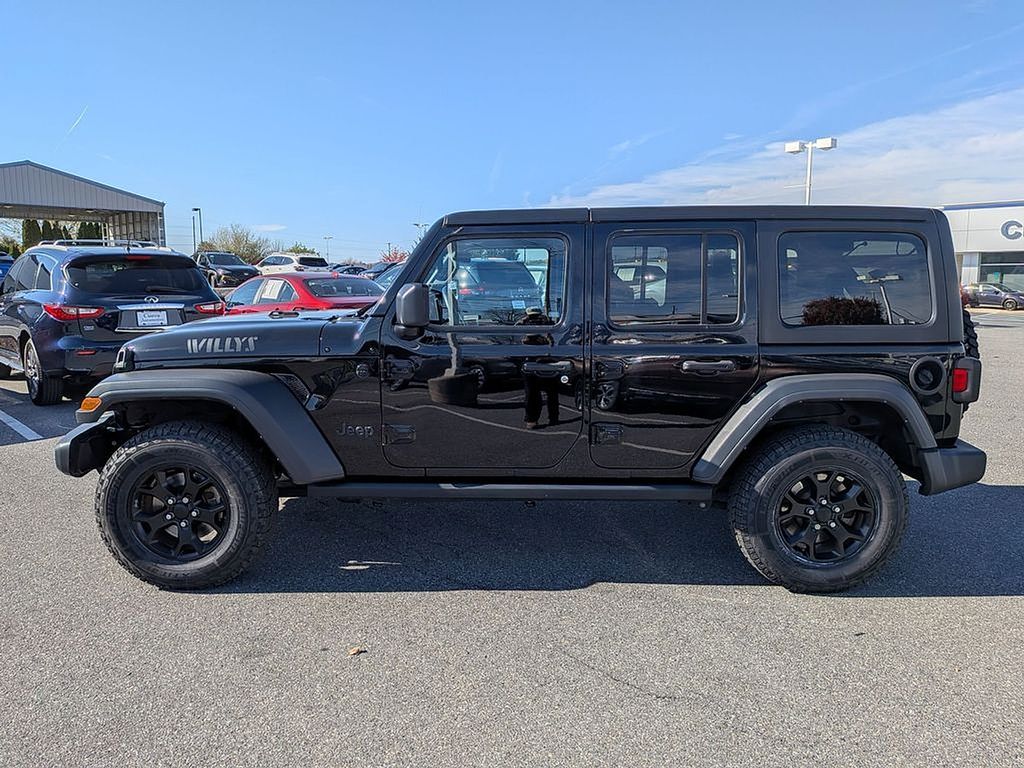 The exterior of this Wrangler Unlimited Willys commands attention with its bold Black paint, Matte Black Jeep badge, and Willys-inspired styling cues. Step inside and you'll be greeted by a well-appointed cabin featuring a 7" color display, leather-wrapped steering wheel, and MOPAR all-weather floor mats.
